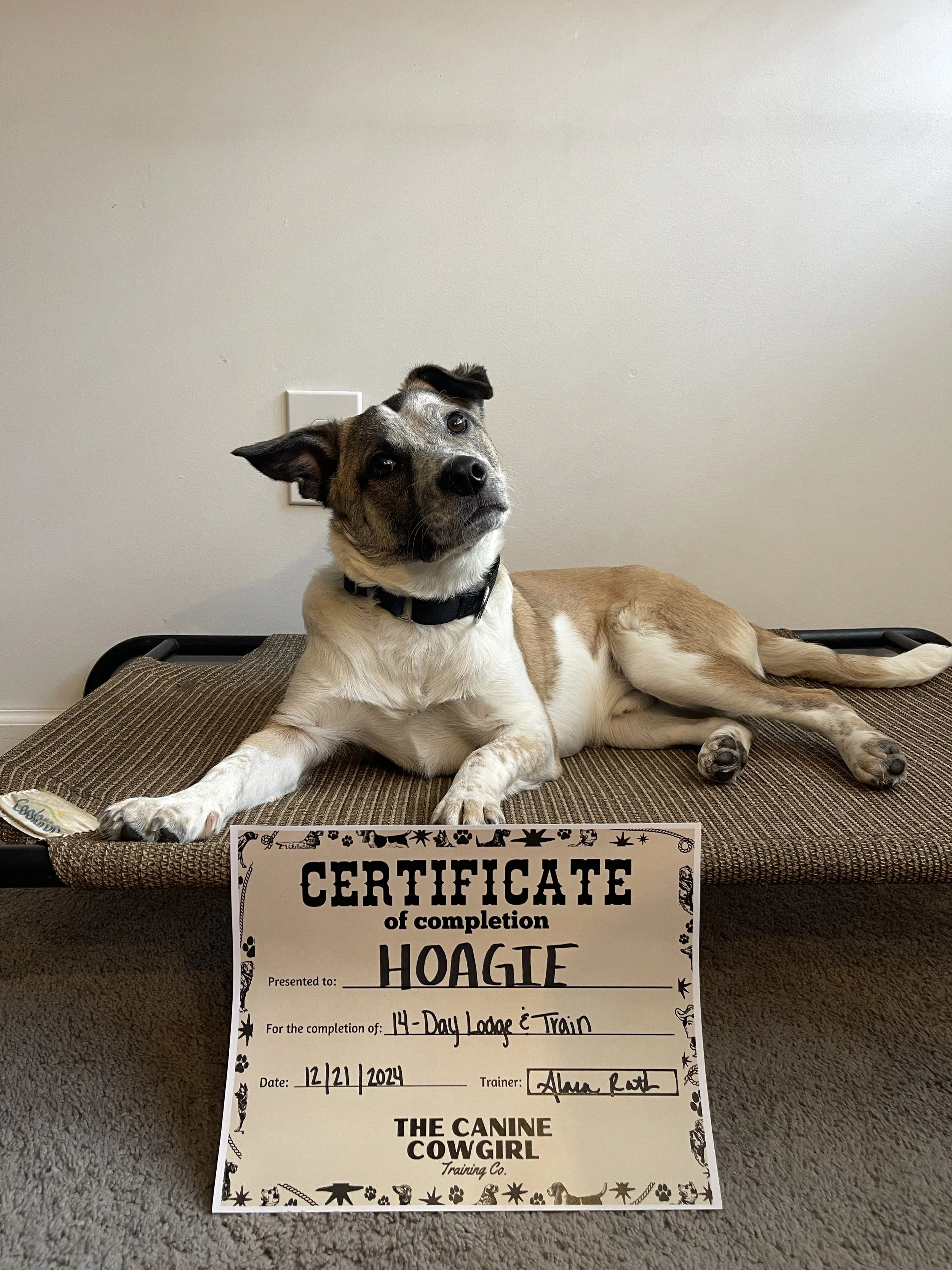“We sent our dog, Hoagie, for a 2 week board and train with Alana and not only did he come back with a new level of understanding expectations/guidelines but we were able to accept him with a new level of understanding him. We were kept in the loop through his entire training process, and practiced the culmination of these things during his “Welcome Home” lesson. He came home prepared to learn and grow with us, and we felt more than prepared to do the same. Alana is a kind, caring, and trustworthy dog trainer who listens to her clients and connects with them on a deeper level. She spent plenty of time getting to know our boy, but getting to know us too. She was extremely professional while still personalizing our experience, and we cant recommend her enough. The individualized attention, and love she showed Hoagie is priceless. We cannot wait for our follow up lesson, and to continue to fine tune the tools we have (and hopefully add more to our toolkit!)”