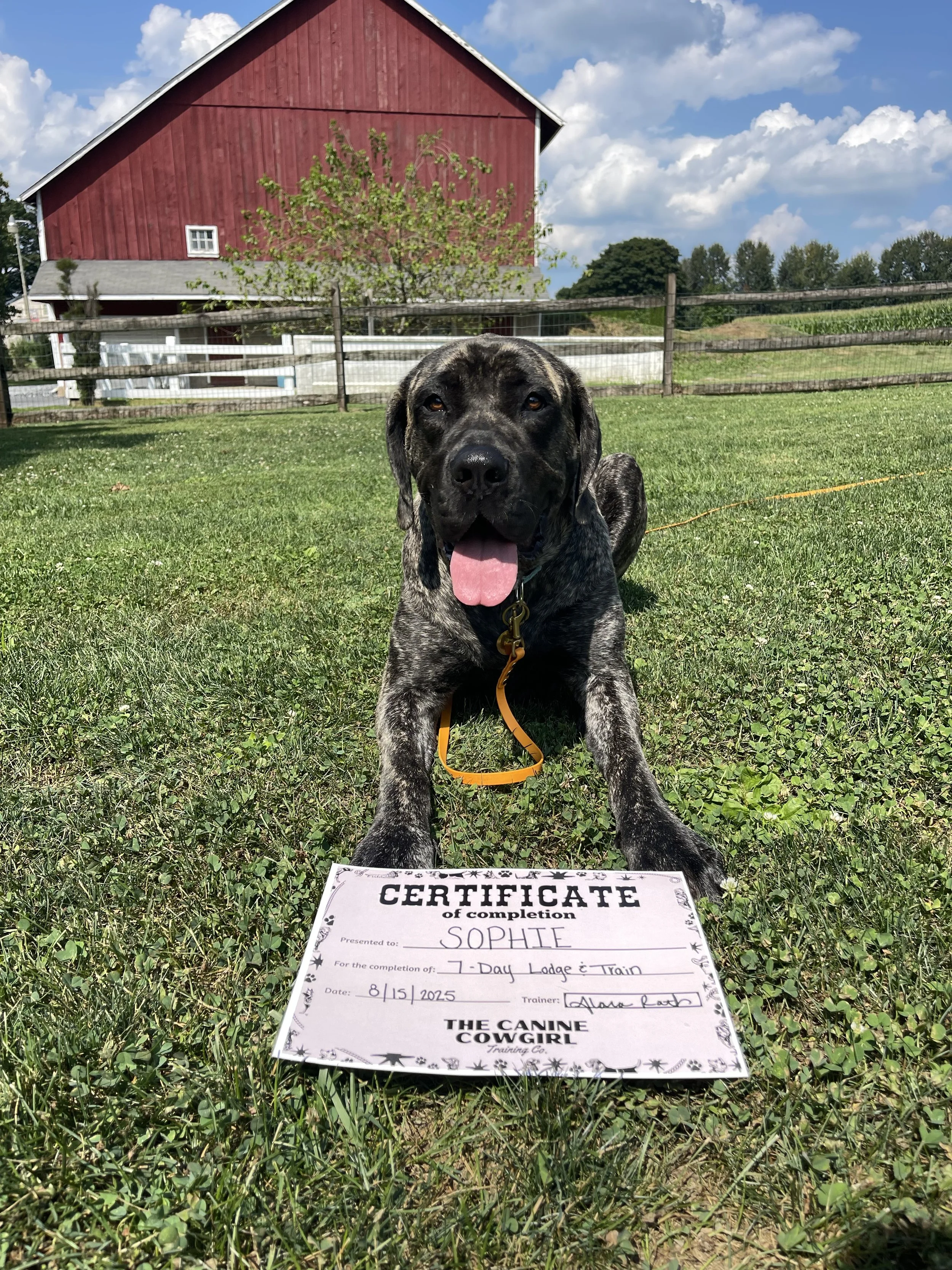 “Sophie has had 3 in home lessons with Alana and did 1 full week or training staying at Alana’s farm. The changes we have seen in Sophie are amazing. Alana was able to boost her confidence, gain her trust, help us to gain her trust and continue to build her confidence. The dog who never wanted to be on a leash now begs to go on walks. We used to have to corner her in the house to get a leash on her and deal with her peeing and pooping all over in the process- now I grab the leash go to the front door- she will see me with the leash and get excited- comes over right away- I’ll let her outside and then tell her we have to leash up and she comes over ready for the leash. It’s just amazing. I feel like I have a whole new dog. Highly recommend Alana! I was at my wits end and truly thought about adding another dog to the mix to teach my dog how to dog. All we needed was Alana!”